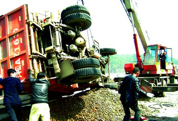 2009年3月14日,吊車正在橋面上對發生側翻的渣土車實施救援。 彭偉 小劉軍 攝