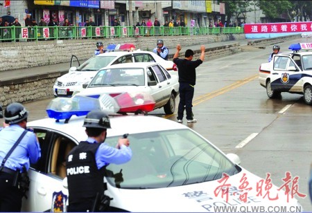 14:58,被搶車輛駛到經一緯二路口,早已就位的巡警立即舉牌示意停車接受檢查,但犯罪嫌疑人拒不停車,而且加速沖關一路向西逃竄。路口巡警見狀,立即驅車追了上去。