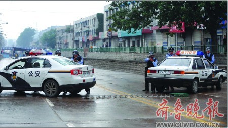 見示意停車無效,根據犯罪嫌疑人逃竄的路線,槐蔭巡警大隊的民警在經一緯十二路路口,布置了兩輛巡邏車,并在馬路中間放置了阻車器,以攔截被搶車輛。