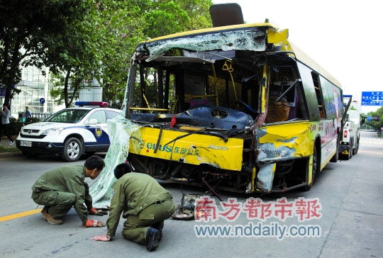深圳朗山“極速”公交車撞泥頭車,13人受傷。涉事的公交車車頭被撞損毀嚴重,工作人員在處理現場。