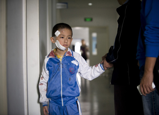 10時許,記者趕到深圳第三人民醫院急診外科,很多學生正在排隊等候。6歲半的鄭榮祺傷得比較嚴重,校服上有多處血跡,眼角和臉部都被劃傷,縫了幾針,眼角帶著淚水,眼神中還有點恐慌。5歲小女孩萬湘傷得最重。剛剛做完檢查后,她閉眼躺在活動車上,不愿跟別人說話。
