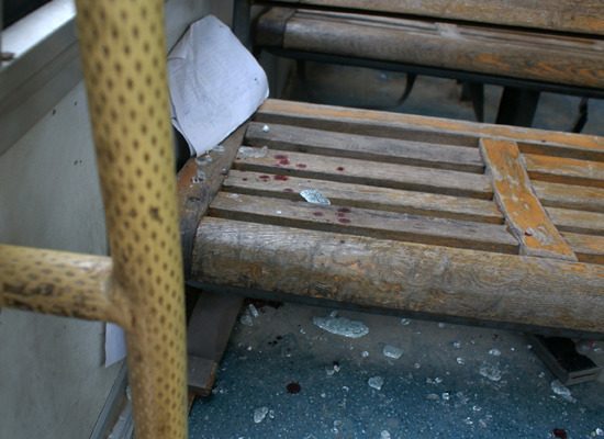 與校車相撞的人貨車,駕駛室嚴重變形,車門扭曲成S形。事發路口的地上仍散落著大量玻璃碎片。