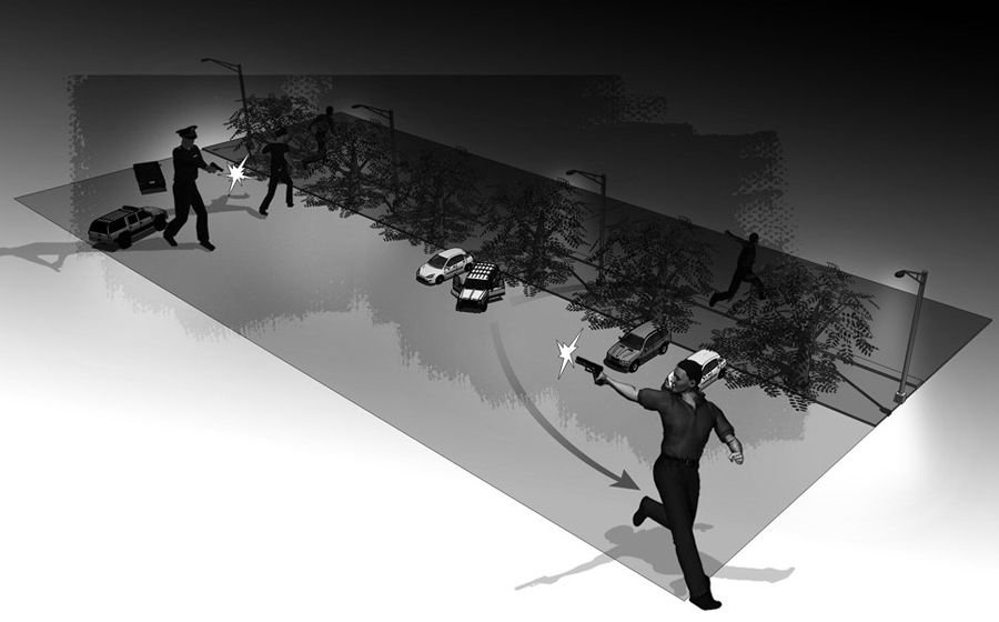 當疑犯正要把贓車開走時,早已埋伏在附近的民警立即行動展開抓捕。兩名疑犯見勢立即奔逃,民警展開追截。其中一名嫌疑人見民警緊追不舍,拔出手槍朝追捕民警射擊。在鳴槍警告無效后,追捕民警隨即向嫌疑人腿部開槍。兩名嫌疑人李×芳、黃×佳被當場擊傷,中槍后,他們又跑了30多米,終于束手就擒。記者在警方后來提供的視頻中聽到當時警匪之間大約開了十余槍。