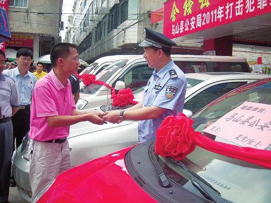 5月的一天晚上,都安的藍先生剛買不久的小車就被盜了。正當他懊惱之時,次日中午12時,馬山公安局民警便在轄區內將他被盜的小轎車追回。在昨日上午的退贓現場,藍先生從民警手中接回愛車的鑰匙后,送上錦旗,以表示感謝。“知道車進入馬山境內后,民警連夜追捕,太辛苦了!”藍先生說,車在都安縣被盜后,他馬上報了案,該縣民警通過車載的GPS定位系統顯示得知車已進入馬山縣境內。隨后,兩地警方通過信息共享,將其愛車追回。